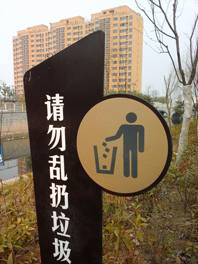 滿布園區(qū)公舍的“請(qǐng)勿亂扔垃圾”警示金屬提示牌邊角鋒利,原為溫馨提示,卻成了兒童玩耍時(shí)的安全隱患。