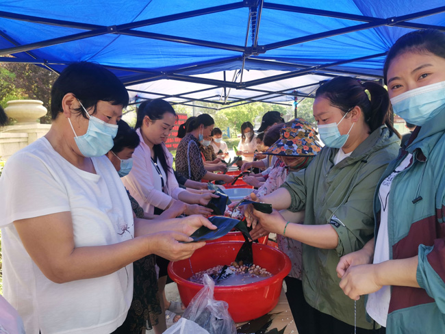 工作人員準(zhǔn)備好粽葉和泡好的糯米、蜜棗、紅豆等食材,大家各顯身手,拿粽葉、捋粽葉、做漏斗狀、填糯米、放餡料、壓緊實(shí)、封口、扎捆,巧手翻飛,不一會(huì)兒,一只只各式各樣的漂亮粽子就堆成了小山。盡管大家包粽子的水平參差不齊,但無論是技術(shù)嫻熟還是新手上路,大家都特別開心,整個(gè)活動(dòng)現(xiàn)場歡聲笑語,其樂融融,好不熱鬧......