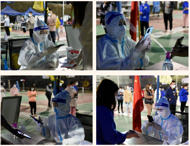 核酸采樣登記是核酸檢測(cè)工作中的重要一環(huán)。采樣登記處的“大白”根據(jù)采樣要求,以10人混檢為單位一一完成掃碼登記,仔細(xì)核對(duì)檢測(cè)人員信息。在封控的宿舍內(nèi),“大白”身披改裝挎包,一邊維持著現(xiàn)場(chǎng)秩序,一邊協(xié)助醫(yī)護(hù)人員掃碼登記,全力當(dāng)好醫(yī)生“好幫手”。