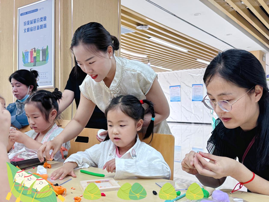 粘土DIY區(qū)同樣妙趣橫生。孩子們?cè)诠ぷ魅藛T的指導(dǎo)下發(fā)揮創(chuàng)意,用粘土捏出惟妙惟肖的彩色“粽子”,在實(shí)踐中感受文化魅力,收獲自信與成就感。