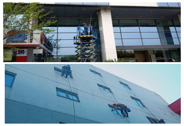 施工現(xiàn)場做好安全保障措施,現(xiàn)場清潔人員配戴安全頭盔、安全帶,嚴(yán)格按操作流程實施外墻清洗。