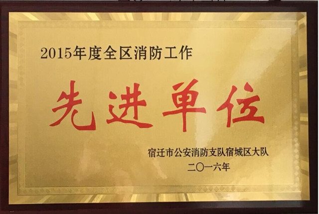 公司在2015年度全區(qū)消防安全工作評定中,喜獲“2015年度全區(qū)消防工作先進單位”榮譽稱號,此次消防安全工作由宿遷市消防支隊宿城區(qū)大隊評定。
